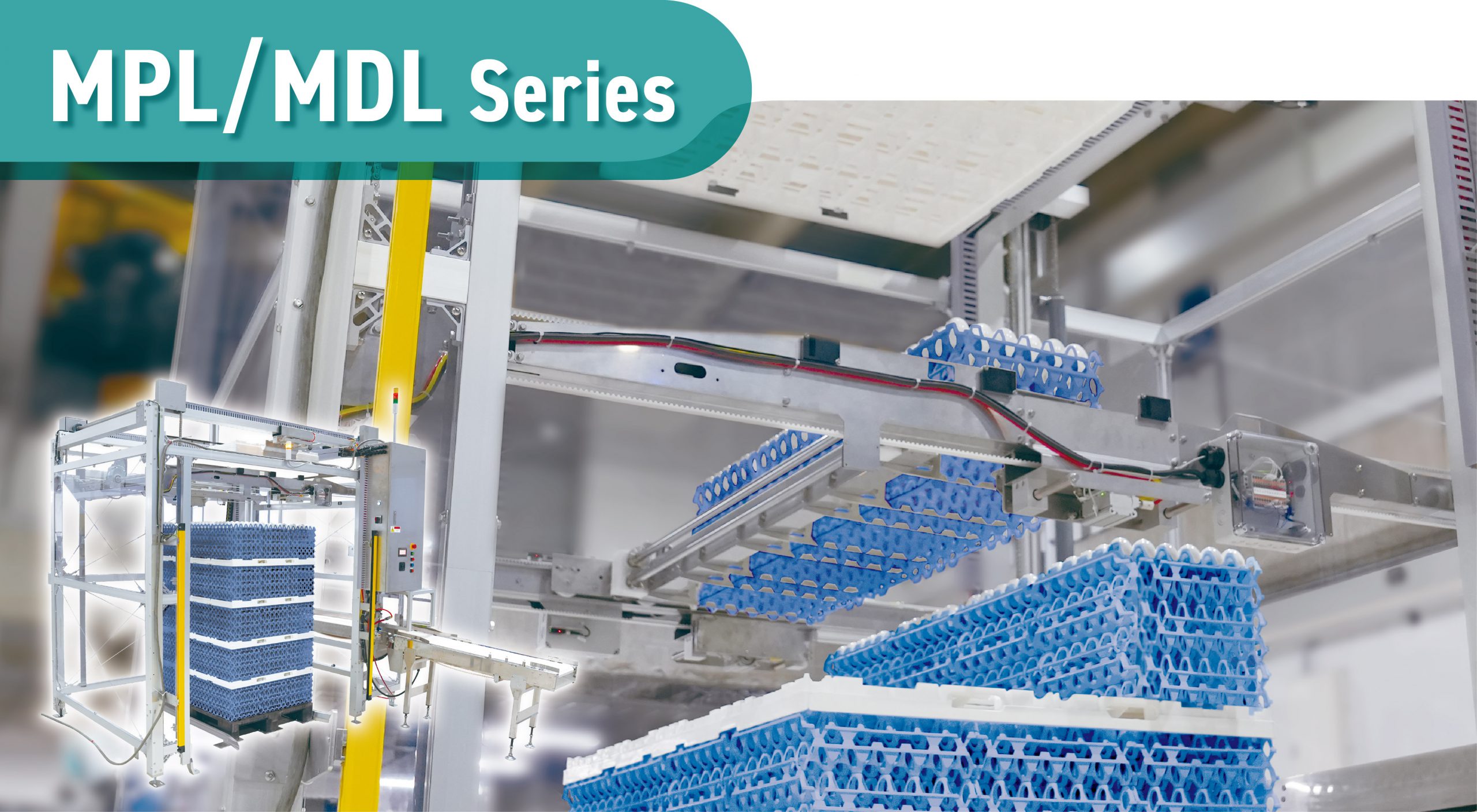 卵が積まれたパレットを最小限の人手で量産できます。